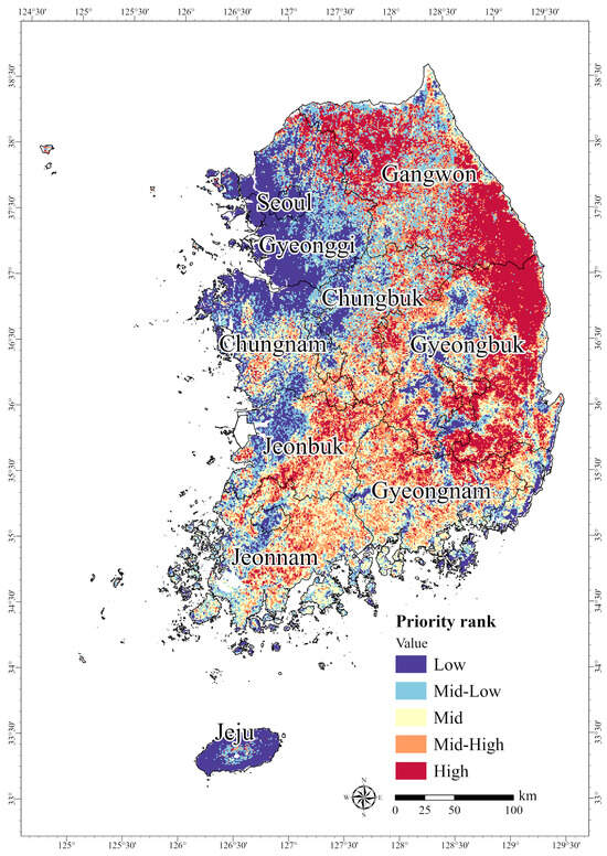 Analysis of the priority rankings derived from the MaxEnt model and Zonation indicated that HPAs for endangered mammal habitats were primarily located in high-altitude forests and forest edges along the Baekdudaegan Mountain Range, particularly in Gangwon and Gyeongbuk (Figure 4). Based on these results, we examined the distribution of priority ranks across the nine administrative regions. The HPAs for endangered mammals (Grade 5, “High”) covered 7218 km2 in Gangwon, followed by Gyeongbuk with 6973 km2. For all of the study sites combined, Grade 1 conservation areas (“Low”) covered 18,821 km2; Grade 2 (“Mid-Low”) and Grade 3 (“Mid”) together covered 19,211 km2; Grade 4 (“Mid-High”) spanned 19,214 km2; and Grade 5 (“High”) accounted for 19,590 km2 (Table 3). Therefore, conservation efforts should prioritize regions in Gangwon and Gyeongbuk, which have HPAs that include the habitats of the five endangered mammals.