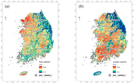 The potential habitats of the endangered birds generated by the MaxEnt model were visualized as species distribution maps, with areas in red indicating a high probability of species occurrence. Unlike the endangered mammals, the four endangered birds had a lower likelihood of occurrence in forested areas in Figure 5, but as birds differ in environment preference during breeding and non-breeding seasons, this is not a complete reflection of their habitat use. For F. subbuteo, the results revealed a high probability of occurrence, primarily in Gyeonggi (Figure 5a). F. subbuteo is known to be distributed throughout South Korea during its breeding season from May to August, with a preference for plains, wetlands, and agricultural areas for foraging [26]. Therefore, the frequency of occurrence was high in Gyeonggi, where the relevant environment is developed [76]. Of the four target bird species, A. soloensis had the widest distribution on the map, with a high probability of occurrence in Chungnam, Jeonbuk, Jeonnam, and Gyeongnam (Figure 5b). Past research has reported that A. soloensis has a nationwide distribution centered on forests, plains, and agricultural areas [76]. The present study also revealed a low probability of A. soloensis occurring in high-altitude areas (Table 4); thus, the probability of A. soloensis inhabiting the parts of Gyeongbuk and Gangwon with mountainous regions was correspondingly low. This finding is consistent with previous research indicating that A. soloensis is frequently observed in most areas except for high mountains in Gangwon and urban areas in some inland regions [76]. A. nisus and A. gentilis, both of which are wintering species in South Korea, are known to inhabit forests and agricultural areas across the country [26]. In the present study, the prediction results for A. nisus (Figure 5c) and A. gentilis (Figure 5d) showed a higher probability of occurrence in inland areas of Gyeonggi, Gyeongnam, and Gyeongbuk. The findings are consistent with those of a previous study showing that the observation frequency of these species was highest in Gyeongbuk [76].