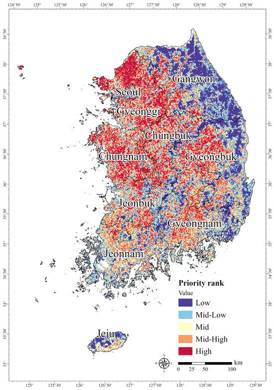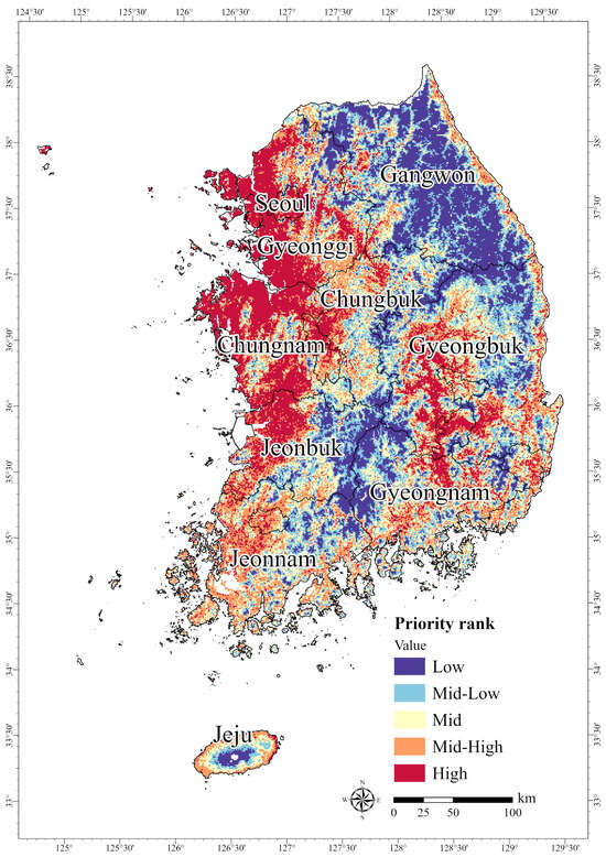 Zonation analysis was also used to derive the PCAs for endangered amphibians and reptiles. HPAs with the highest priority rank (Grade 5, “High”) were found in coastal areas and water bodies in Gyeonggi and Chungnam, as well as parts of Gyeongbuk Province (Figure 8). In terms of the priority ranking within the nine administrative regions, Gyeonggi, with the highest ranking, contained the largest area at 5052 km2, followed by Chungnam at 5149 km2 and Gyeongbuk at 3212 km2 (Table 7). Overall, 18,823 km2 of the study area had a priority ranking of Grade 1 (“Low”); 19,199 km2 was Grade 2 (“Mid-Low”); 19,198 km2 was Grade 3 (“Mid”); 19,194 km2 was Grade 4 (“Mid-Low”); and 19,559 km2 was Grade 5 (“High”). Based on these results, to ensure the protection of habitats for endangered amphibians and reptiles, conservation strategies should be established for the HPAs in Gyeonggi and Chungnam Provinces.