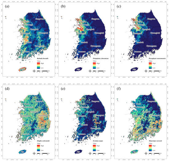 Potential distribution of three endangered amphibians designated in South Korea: (a) Kaloula borealis, (b) Pelophylax chosenicus, and (c) Dryophytes suweonensis and three endangered reptiles designated in South Korea: (d) Elaphe schrenckii, (e) Eremias argus, and (f) Mauremys reevesii. Red shading represents a high probability of species occurrence.
