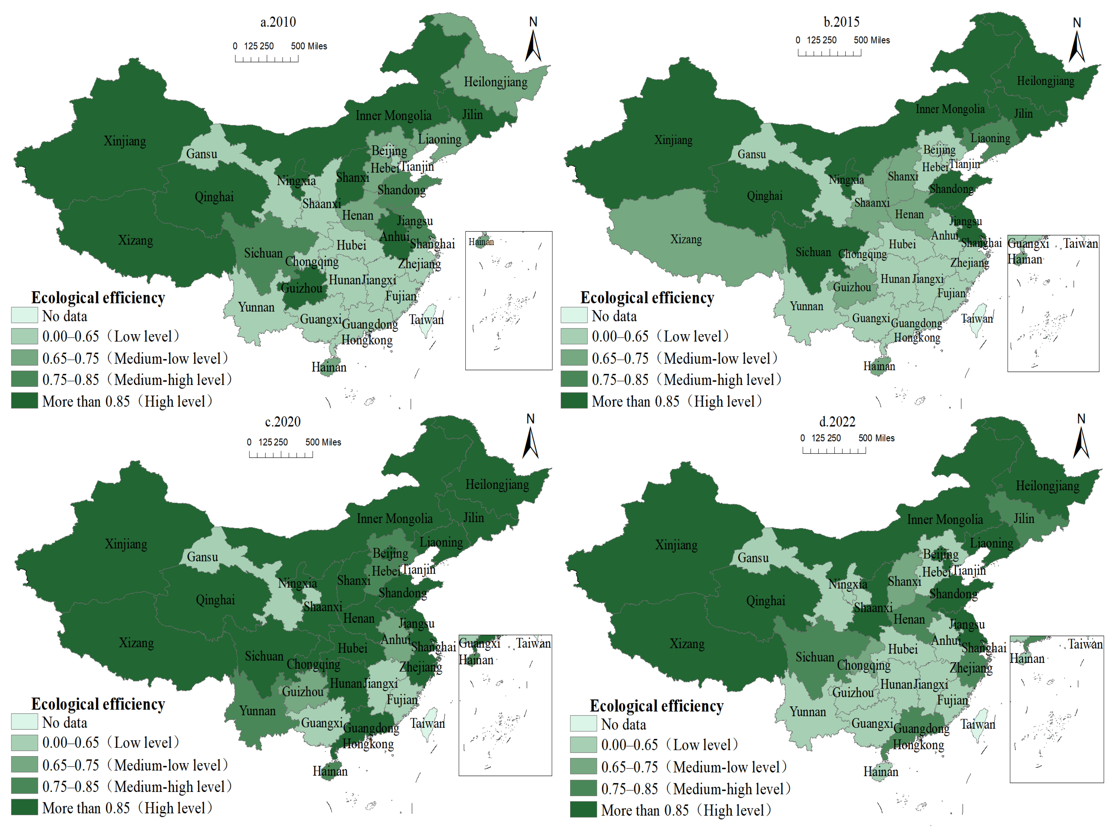 EE in animal husbandry showed a variable drop from 2010 to 2015. The possible explanations are as follows: On the one hand, the scale of animal husbandry continued to grow, but production efficiency was not significantly improved, and resource utilization was low; on the other hand, breeding subjects have low environmental awareness and ignore ecological benefits, reducing EE. During the period 2016–2022, the efficiency value increased, which could be attributed to the government’s increased emphasis on clean animal husbandry production, which included measures such as demarcating prohibited breeding areas, collecting sewage treatment fees, and strengthening certification management of green animal products to promote the improvement of animal husbandry EE [5,44].