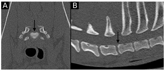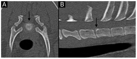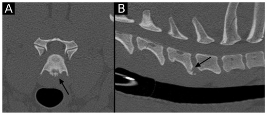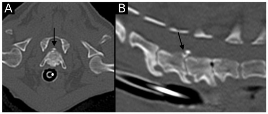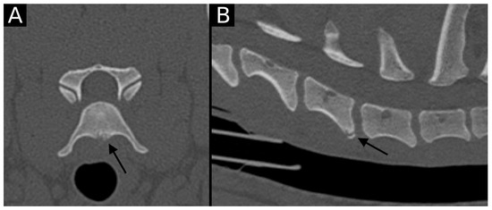 Transverse (A) and sagittal (B) reconstructions in the bone algorithm in the only dog with an intervertebral disc herniation. The C6–C7 intervertebral space is markedly narrowed, with the presence of moderate to marked spondylosis deformans, mild endplate sclerosis and mineralized herniated disc material. An irregularly defined contour defect is observed at the dorsal aspect of the caudal endplate of C6 (arrow). This was classified as EPJA Type A. The adjacent intervertebral disc spaces are also narrowed, with endplate sclerosis and spondylosis deformans. The vacuum phenomenon is also observed at C7–T1.