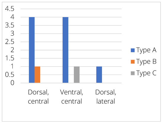 A total of 11 intervertebral disc spaces of 10 different dogs presented EPJA along the cervicothoracic junction, with the following grading distribution: Type A—nine cases; Type B—one case; and Type C—one case. No Type D were observed in the present study. The location of the lesion was ventral–central in five cases (four Type A, one Type C), dorsal–central in five cases (four Type A, one Type B), and dorsal–lateral in one case (Type A) (Figure 5).