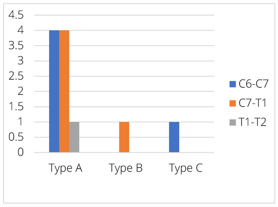When distributed along the different IVD levels, five EPJA were observed in C6–C7, five at C7–T1, and one at T1–T2. At C6–C7, four cases were Type A and one case was Type C. At C7–T1, four cases were Type A and one case Type B. At T1–T2, the only case was Type A (Figure 6).