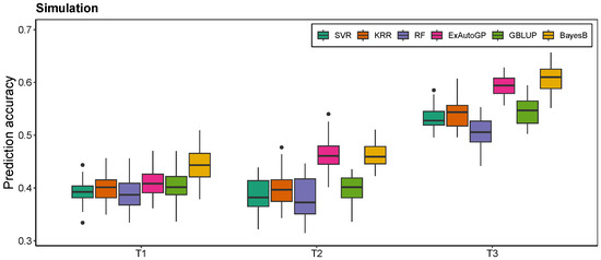 As expected, ExAutoGP significantly outperforms the other three traditional ML methods, namely SVR, KRR, and RF, in all the evaluation datasets. The average prediction accuracy of ExAutoGP over the three datasets is improved by 7.5%, 7.46%, and 28.73% over SVR, KRR, and RF, respectively, with the improvement in each trait ranging from 0.4% to 20.8%, 1.8% to 24.5% and 6.4% to 58.2%. In the simulated dataset (Figure 2), ExAutoGP achieved an average prediction accuracy of 0.489, representing an increase of 11.9%, 9.5%, and 16% compared to SVR (0.437), KRR (0.447), and RF (0.422), respectively. Notably, for the T2 trait, ExAutoGP exhibited substantial improvements over SVR (20.8%), KRR (17%), and RF (23.7%). On the cattle dataset (Figure 3), ExAutoGP showed different degrees of improvement over SVR, KRR, and RF on all three traits, with a 44.6% improvement in ExAutoGP’s prediction accuracy over RF on the SCS trait. On the chicken dataset (Figure 4), for the EW28 trait, ExAutoGP’s prediction accuracy improved by 18.4%, 15.3%, and 53.6% over SVR, KRR, and RF, respectively. Similarly, ExAutoGP improved by 7.6%, 24.5%, and 43.6% over SVR, KRR, and RF on the EW72 trait. For the EW80 trait, ExAutoGP improved the prediction accuracy over RF by up to 58.2%. Detailed information on the 5-fold cross-validated Pearson correlation coefficients for five replications is in Supplementary Tables S1–S3.