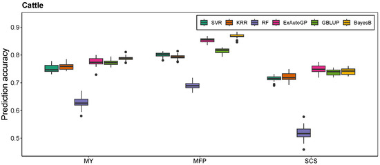 Comparison of the prediction accuracy of SVR, KRR, RF, ExAutoGP, GBLUP, and BayesB on the Holstein cattle dataset. For the box-and-line plot, the line in the middle of the box indicates the median average correlation, the top of the line extending above the box indicates the maximum value, the bottom of the line extending below indicates the minimum value, and outliers indicate outliers.
