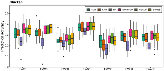 Comparison of prediction accuracies of SVR, KRR, RF, ExAutoGP, GBLUP, and BayesB for the chicken dataset. For the box-and-line plot, the line in the middle of the box indicates the median mean correlation, the top of the line extending above the box indicates the maximum value, the bottom of the line extending below indicates the minimum value, and outliers indicate outliers.