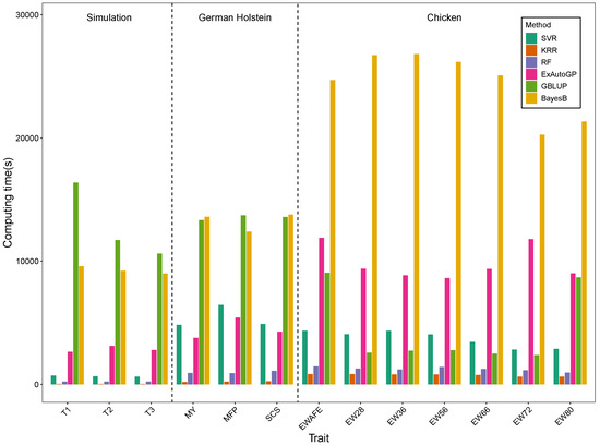 We compared the computational time required by the six genomic prediction methods to generate predictions on the three datasets, as shown in Figure 5. The run times are in seconds, and all methods were run on computers equipped with high-performance servers (CentOS Linux 8 operating system, Intel(R) Xeon(R) Gold 5318H CPU @ 2.50GHz processor, 144 CPU cores, and 1TB total memory). To improve efficiency, parallel processing is used for the 5-fold cross-validation of each method. The computational process of TPOT is more time-consuming, as it requires searching for the best machine learning pipeline through continuous iterations. Nevertheless, ExAutoGP runs two to six times faster than BayesB on all three datasets. On both the simulated and chicken datasets, ExAutoGP required more computational time compared to SVR, KRR, and RF. Nonetheless, its fully automated process may mitigate the additional time cost associated with manual hyperparameter tuning. BayesB had the longest average runtime, primarily due to the iterative nature of the Markov Chain Monte Carlo algorithm, which requires extensive iterations to achieve convergence. This issue was particularly pronounced in the chicken dataset, where the substantially larger number of SNPs further exacerbated BayesB’s computational burden. A detailed breakdown of the computational times for each method is provided in Supplementary Table S4.