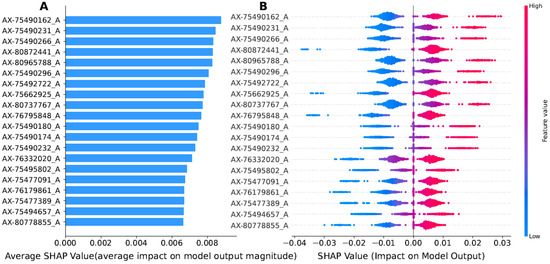 We systematically assessed the importance of each trait variable in the ExAutoGP model and its contribution to model prediction using the SHAP method on real traits (see Figure 6 and Figures S1–S9). To illustrate this approach, we present the example of the EWAFE trait from the chicken dataset. On the basis of the model performance evaluation, we further calculated SHAP values to quantify the impact of individual traits on the prediction results. The trait importance bar chart (Figure 6A) illustrates the ranking of trait importance determined based on the mean absolute value of SHAP values, listing the top 20 most important key variables in descending order. These values reflect the average impact of the individual features on the magnitude of the model output. The results show that the AX-75490162_A locus has the most significant contribution among the 20 key loci, followed by AX-75490231_A and AX-75490266_A loci. It is important to note that the feature importance visualization in Figure 6A only includes variables retained after the feature selection process, and all features are displayed with their original nomenclature.