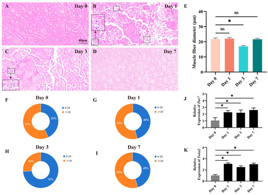 Histological section analysis of the fast muscle during the damage and repair process. HE staining shows cross-sections of fast muscle on days 0, 1, 3, and 7 of muscle injury (A–D). Inflammatory cells have been marked with black square frames (B,C). Cross-sectional area distribution of muscle fibers on days 0, 1, 3, and 7 after muscle injury (E). Frequency distribution of muscle fiber diameters on days 0, 1, 3, and 7 after muscle injury (F–I). The expression of Pax7 and Twist2 after muscle injury in Chinese perch (J,K). Values in graphs are mean ± SE, n = 3. * Indicates a significant difference between groups (p < 0.05). ns stands for no significant difference (p > 0.05).