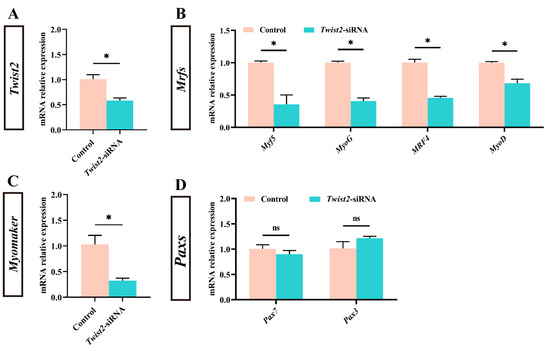 Effect of Twist2-siRNA injection on the expression of genes related to muscle growth. The relative expression of Twist2 (A). The relative expression of Myf5, MyoG, MRF4 and MyoD (B). The relative expression of Myomaker (C). The relative expression of Pax7 and Pax3 (D). Values are plotted as mean ± SE, n = 6. * Indicates the significant difference between the control and the Twist2-siRNA groups (p < 0.05). ns stands for no significant difference (p > 0.05).