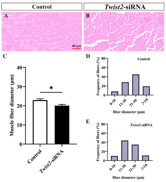 Histological section analysis of fast muscle in the control and Twist2-siRNA groups. HE staining showed cross-sections of fast muscles in the control and Twist2-siRNA groups (A,B). The muscle fiber diameters in the control and Twist2-siRNA groups (C). Frequency distribution of muscle fiber diameters in the control and Twist2-siRNA groups (D,E). Values in the figures are the mean ± SEM, n = 6. * Indicates the significant difference in expression between the control and Twist2-siRNA groups (p < 0.05).