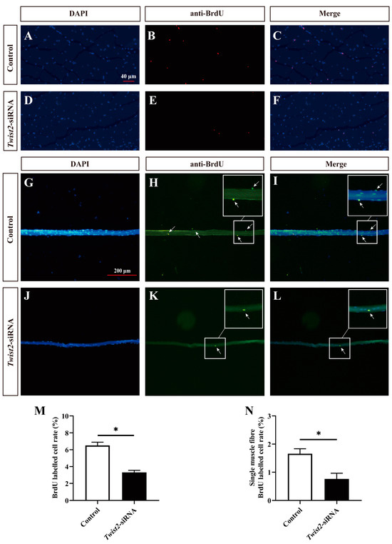 Effects of interfering with Twist2 expression on myoblast proliferation. Immunofluorescence labeling of the transverse section of muscle fibers in the control and Twist2-siRNA groups (A–F). Immunofluorescent labeling of single muscle fibers in the control and Twist2-siRNA groups (G–L). Nuclei were labeled with DAPI (blue), proliferating cells in cross-sections of muscle fibers were labeled with BrdU antibody (red), and proliferating cells of single muscle fibers were labeled with BrdU antibody (green), the arrows indicate BrdU positive cells. (M) Comparison of proliferating cell frequencies in muscle fiber cross-sections between the control and Twist2-siRNA groups. (N) Comparison of proliferating cell frequencies of single muscle fibers in the control and Twist2-siRNA groups. The scale bars for muscle fiber cross-sections and single muscle fibers were 40 µm and 200 µm, respectively. * Indicates the significant difference in expression between the control and Twist2-siRNA groups (p < 0.05).
