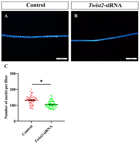 Analysis of the number of nuclei in single myofiber cells in the control and Twist2-siRNA groups. Single muscle fibers from the control (A) and Twist2-siRNA (B) groups were isolated and stained with DAPI (blue). Statistical analysis of nuclear numbers in muscle fibers from the control and Twist2-siRNA groups (C). Values in the figures are the mean ± SEM, n = 60. Each red triangle and each green circle represent the number of individual nuclei in the control and Twist2-siRNA groups, respectively. * Indicates the significant difference between the control and the Twist2-siRNA groups (p < 0.05).