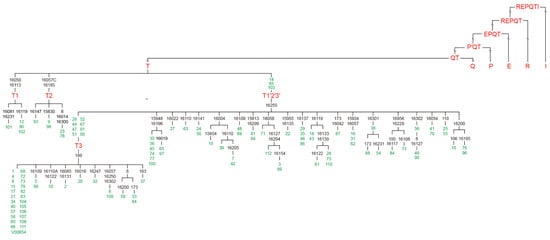 The phylogenetic tree reconstruction shown in Figure 2 graphically reports the genetic relationship within the HG—24 out of 110 samples matched with BRS and sub-branches within T3 are detectable, but not sufficiently informative for a sub-haplogroup classification due to the partial mitogenome sequence tested in this study (Figure 2).