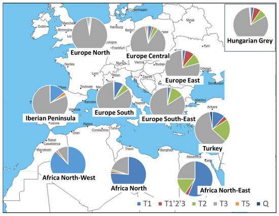 Bos taurus haplogroup distribution grouped in macro-geographic areas of Europe, North Africa, and Turkey compared to the HG as reported in the upper box (the map was retrieved from https://d-maps.com/, accessed on 11 November 2024).