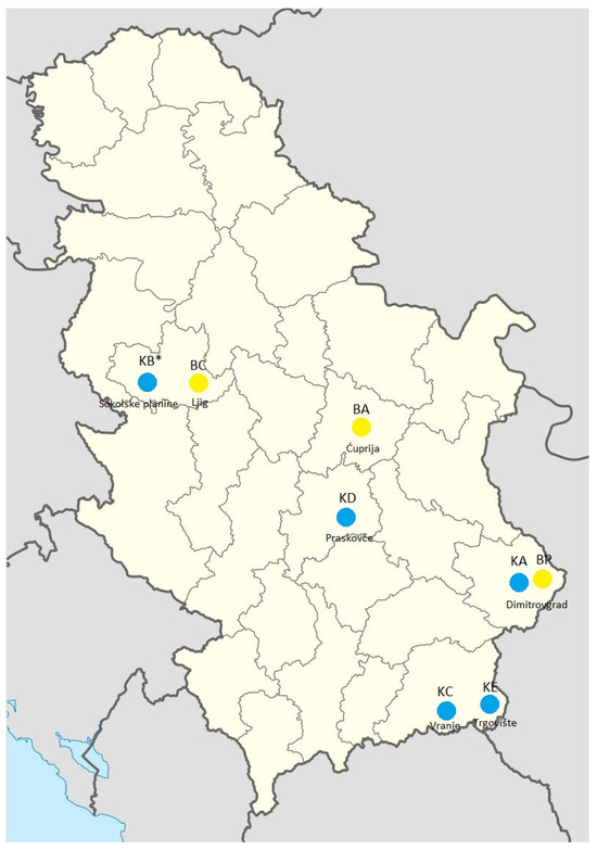 In Serbia, Karakachan sheep are present in the municipalities of Dimitrovgrad, Bosilegrad, Vranje, and Kruševac in the southern part of the country and at the Sokolske kolibe site in the central part of Serbia (Figure 2) where only animals with black wool are present (Figure 1D–F). According to the data from the herd book, the number of registered Karakachan sheep under production trait control was 176 in 2019, when the sampling for our study was initiated. This number increased to 345 in 2024.