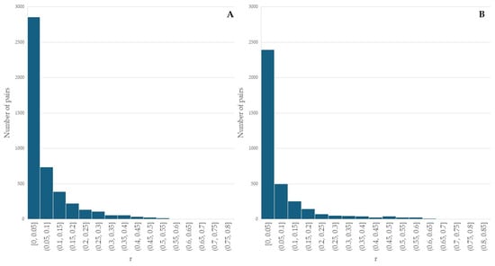 The pairwise relatedness (r) between 97 Bardoka ewes ranged from 0 to 0.759, with the majority of pairs (90.0%) having r ≤ 0.2, and 28 pairs (0.6%) having r ≥ 0.5, with an average of 0.06 (Figure 3A). The pairwise relatedness between 86 Karakachan sheep ewes ranged from 0 to 0.814, with the majority of pairs (90.0%) having r ≤ 0.2, and 79 pairs (2.1%) having r ≥ 0.5, with an average of 0.07 (Figure 3B). Although first-order relatives were not present in the same but in different flocks, it was necessary to exclude one individual from each of the Bardoka and Karakachan sheep pairs with r ≥ 0.5 to ensure the genetic analysis of unrelated individuals at the population level [56]. We used inbreeding values of individuals (I) as exclusion criteria, which in Bardoka ranged from 0 to 0.3 in all individuals with one exception (one individual had I = 0.554), and averaged 0.06 (Figure 4A). In the Karakachan sheep, eight individuals had 0.3 ≤ I ≤ 0.5 and one had I = 0.640, while the average I value was 0.09 (Figure 4B). An individual with the higher I value from a pair with r ≥ 0.5 was excluded and, in that way, we assembled a data set for all further analyses which included 77 Bardoka ewes and 61 Karakachan ewes (Table 2).