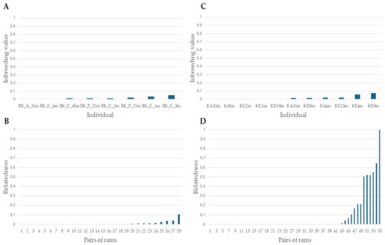 Figure 5. Inbreeding values and pairwise relatedness of Bardoka and Karakachan sheep rams; (A) inbreeding values of Bardoka rams; (B) pairwise relatedness of Bardoka rams; (C) inbreeding values of Karakachan sheep rams; and (D) pairwise relatedness of Karakachan sheep rams.
