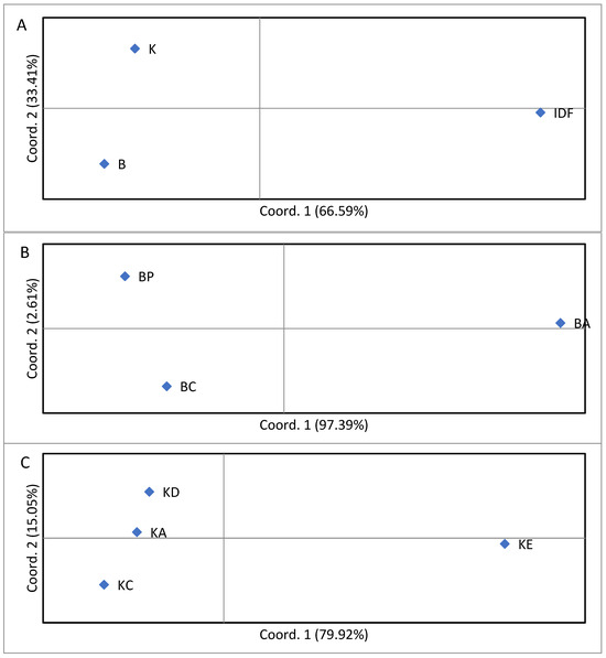 Figure 6. (A) PCoA with Bardoka, Karakachan, and Ile-de-France sheep used for a comparison; (B) PCoA with the BA, BC, and BP flocks of Bardoka; (C) PCoA with the KA, KC, KD, and KE flocks of Karakachan sheep.