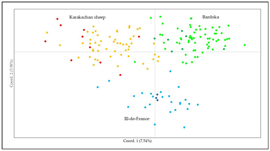 Figure 7. PCoA with Bardoka, Karakachan, and Ile-de-France ewes and rams; Bardoka rams are indicated with dark green circles, Bardoka ewes with light green circles, Karakachan rams with red circles, Karakachan ewes with yellow circles, Ile-de-France rams with dark blue circles, and Ile-de-France ewes with light blue circles.