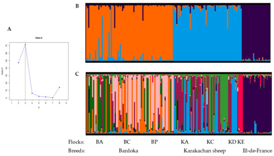 Figure 8. Outcomes of the Bayesian clustering with Bardoka, Karakachan, and Ile-de-France ewes; (A) the optimal number of gene pools according to the ΔK method of Evanno et al. (2005) [53]; (B) genetic structure presented with individual q values at K = 3; and (C) genetic structure presented with individual q values at K = 8.