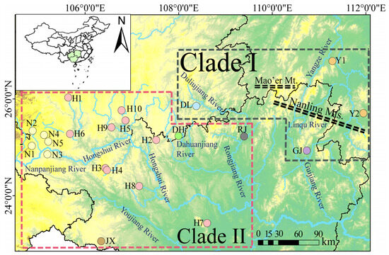 Southwest China stands as a global biodiversity hotspot, shaped by its exceptional geological history and climatic complexity [1,2]. This region, a Quaternary glacial refuge [3], occupies a unique biogeographic position at the convergence of Pacific and Indian monsoon systems. Its dramatic elevational gradients—spanning the Qinghai–Tibet Plateau (QTP), the Yunnan–Guizhou Plateau, and the Sichuan Basin—have created three distinct topographic tiers that foster the ecological adaptive differentiation of species. Major mountain systems, including the Himalayas, Kunlun Mountains, and Hengduan Mountains, act as formidable biogeographic barriers, driving species diversification [4]. The region’s hydrologic architecture further enhances its biological significance. Additionally, the region boasts numerous rivers and lakes, with the central and northern parts dominated by rivers in the Yangtze River basin. Meanwhile southern networks converge into the Pearl River Basin—South China’s largest fluvial system comprising the East, West, and North Rivers, along with tributaries like the Beipan and the Liujiang Rivers [5]. These river networks have been profoundly shaped by Neogene uplift events, particularly the formation of the Nanling Mountains, which established genetic barriers between the Yangtze and the Pearl River biotas [6,7,8]. Mao’er Mountain, located in the northeastern part of Guangxi, is the main peak of Yuecheng Ridge—one of the five major ridges of the Nanling Mountains. It served as the source area for several important rivers, including the Lijiang, the Zijiang, and the Xunjiang Rivers, and is also one of the sources of the Liujiang River. Its strategic position bridges the Yangtze River and the Pearl River [9,10]. Furthermore, the uplift of the QTP was closely related to the collision between the Indian Plate and the Asian Plate in the early Cenozoic, which may have been the largest orogenic event in the history of the Earth [11]. This collision not only triggered the significant uplift of the QTP but also profoundly influenced the climate pattern of Asia [12]. The formation of the East Asian monsoon, the South Asian monsoon, and the plateau monsoon, which play a controlling role in the climate of Southwest China, has been closely related to the uplift of the QTP [13]. In addition, the uplift of the QTP also promoted the development of large-scale drainage patterns and provided unique environmental conditions that facilitated speciation and biodiversity of organisms on and around the plateau [11,14]. For example, the species diversity of Sinocyclocheilus Fang, 1936 is closely related to the periodic uplift and erosion of the QTP [15]. It can be seen that the formation of the Asian monsoon and its impact on the climate evolution of Southwest China are important manifestations of the uplift of the QTP in terms of climate and biodiversity. This orographic–climatic interplay maintains the humidity gradients and thermal stability essential for preserving paleoendemic lineages in karst ecosystems [16].