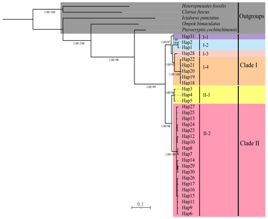 Utilizing all haplotypes from the concatenated mtDNA sequences (COI and Cyt b), the phylogenetic relationships among populations of the cavefish P. anomala distributed in Southwestern China were reconstructed. This was accomplished through the application of Bayesian Inference (BI) with MrBayes V3.2.1 software [35] and Maximum Likelihood (ML) analysis within the IQ-tree module of PhyloSuite v1.2.2 software [36]. Clarias fuscus (Lacepède, 1803), Ictalurus punctatus (Rafinesque, 1818), Ompok bimaculatus (Bloch, 1794), Heteropneustes fossilis (Bloch, 1794), and Pterocryptis cochinchinensis (Valenciennes, 1840) were selected as the outgroups for phylogenetic studies. Based on the Akaike Information Criterion (AIC), the optimal nucleotide substitution model, GTR + I + G, was selected for BI analysis using MrModelTest v.2 [37]. The total number of generations for Markov Chain Monte Carlo (MCMC) computation was 2,000,000, with the analysis starting from a random tree and sampling once every 1000 generations. The average standard deviation of split frequencies was less than 0.01, indicating that the sampling of the posterior distribution was sufficient. The ML tree was constructed using IQ-tree module, employing the TVM + F + G model and incorporating the ultrafast bootstrap method. Node support was evaluated through a bootstrap process comprising 5000 replicates. By conducting statistics on the remaining trees, a consensus tree with posterior probability values greater than 50% was generated. Then, the first 25% of the resulting phylogenetic trees was discarded as part of the burn-in process. Finally, the phylogenetic trees were visualized and edited using Interactive Tree of Life (iTOL) v4 [38].
