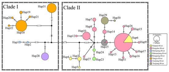 The phylogenetic trees based on concatenated mitochondrial gene sequences revealed two main branches within the species P. anomala; the Clade I consisted of three minor clades: I-1, the sample from DL, belonged to the Duliujiang River; I-2, the sample from GJ, belonged to the Guijiang River; and I-3 and I-4, the samples from Y1 and Y2, which belonged to the Yangtze River. Clade II consisted of two minor clades, II-1 and II-2, which included the remaining P. anomala populations, all of which belonged to the Pearl River (Figure 2). Haplotype network analyses revealed distinct genetic structuring, with all studied individuals clustering into two major clades (Figure 3), a pattern that was consistent with both BI and ML phylograms. However, due to the low intraspecific polymorphism and with no significant population differentiation, we did not construct phylogenetic trees based on nuclear genes for the P. anomala populations.