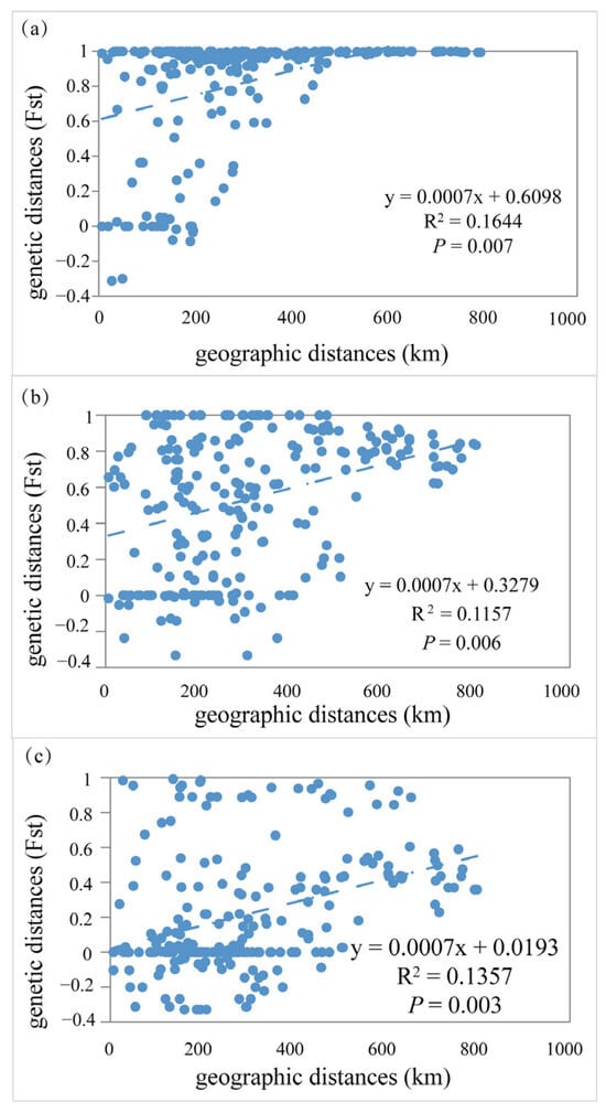 MtDNA-based pairwise genetic differentiation Fst between the 22 sites ranged from −0.08 to 1.00 based on the mtDNA (Table S6). Pairwise estimates of Fst between populations ranged from −0.09 to 0.98 based on the RAG1 and ranged from −0.33 to 0.98 based on the PLAGL2 sequences (Tables S7 and S8). In addition, the Mantel test generated r values of 0.263 (p = 0.007), 0.397 (p = 0.006), and 0.308 (p = 0.028) for mtDNA, RAG1, and PLAGL2 data, respectively, when evaluating the genetic diversity and geographical distance in the P. anomala populations (Figure 4).