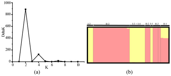 The results of structure analysis: (a) plot of delta K distribution of P. anomala sites; (b) histogram of the structure analysis for the model with K = 2; the x-axis shows clades, the proportion of each color represents the likelihood of each individual being assigned to the corresponding cluster.