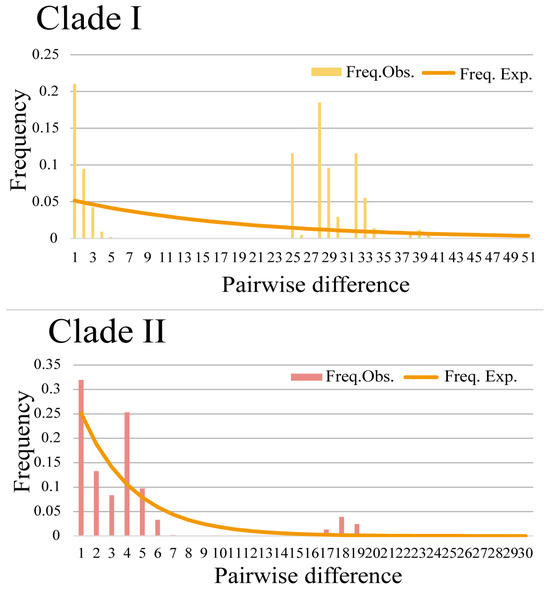 Mismatch distributions of two clades of P. anolama inferred from mtDNA sequences.