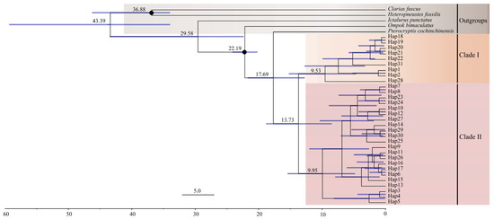 Based on the combined mitochondrial gene data, the divergence times among haplotype lineages of all populations were calculated using BEAST v2.4.7 [51], employing the GTR + I + G substitution model. Due to the lack of known fossil records for this group, two calibration points were employed as suggested by Chen et al. [52] and Kappas et al. [53], including (1) the first appearance of the African Clariidae being in the Lower Eocene (34–56 Mya) and (2) the divergence of Ompok bimaculatus from P. cochinchinensis (22.08 Mya). The outgroups include Clarisa fuscus, Ictalurus punctatus, Ompok bimaculatus, Heteropneustes fossilis, and P. cochinchinensis. Three separate MCMC chains were run for 20 million generations each, sampling every 1000 generations. Analyses used a relaxed lognormal clock model and a Yule process. Convergence was checked in TRACER v1.7 [54], ensuring effective sample sizes exceeded 200. TreeAnnotator (BEAST v2.4.7 package) was used to generate a maximum clade credibility (MCC) tree, discarding the first 25% as burn-in. The resulting tree, including divergence time estimates, was visualized using FigTree v1.4.3 [55].