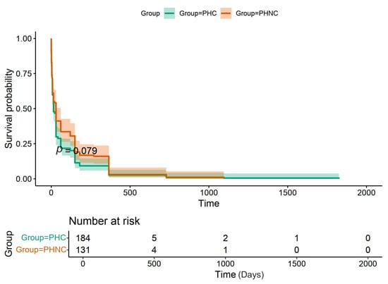 The survival analysis of overall survival time from the duration of clinical signs before being presented to diagnosis in the castrated (PHC) and non-castrated (PHNC) groups with no significant difference between the groups (p = 0.079).