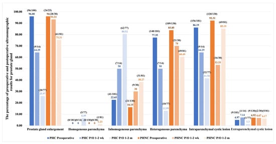 The percentage of preoperative and postoperative (P/O) ultrasonographic results for prostate gland in perineal hernia (PH) dogs associated with prostatic disorders between the castrated (PHC) and non-castrated (PHNC) groups.