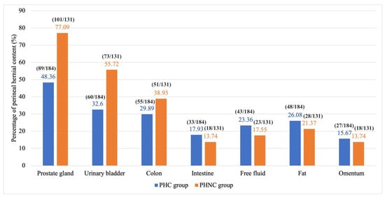 The percentage of perineal hernia (PH) content at the time of surgery between the castrated (PHC) and the non-castrated (PHNC) groups.