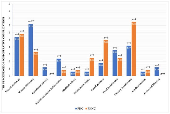The percentage of postoperative complications between the castrated (PHC) and the non-castrated (PHNC) groups.