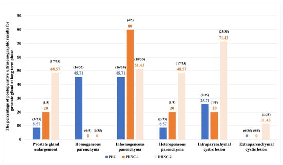 One hundred and sixty-five of the PHC and 115 of the PHNC groups were available for follow-up in this phase. The preoperative clinical signs were significantly improved in the PHC group (PHC: 67.88% (112/165), PHNC: 30.43% (35/115), χ2 = 38.10, p < 0.001). The incidence of UTIs/cystitis was higher in the PHNC group (64.29% (9/14) vs. 80% (28/35) p = 0.29), as shown in Table 2. The prostatic changes observed following surgery are shown in Figure 2. During this phase, the enlargement of the prostate gland was significantly greater in the PHNC group (p = 0.025). There were no significant differences in the echogenicity of the prostate gland, as well as in the intraparenchymal and extraparenchymal cystic lesions between the groups (p = 0.20, 0.32, and 0.15, respectively). After surgery, three PHC dogs died days later, and one PHNC dog was euthanized due to severe UB necrosis rupture. During this phase, recurrent PH was observed in three dogs in the PHC and PHNC groups.
