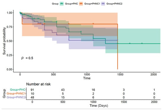 The survival analysis of overall survival time from the duration of no recurrent perineal swelling post-surgery to the last follow-up between the castrated (PHC) and non-castrated (PHNC) groups. These are categorized into two subgroups: castrated within 2 months after perineal herniorrhaphy (PHNC-1) and intact or castration after 2 months of follow-up (PHNC-2) (no significant difference; p = 0.5).