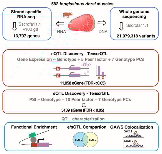 Overview of study design and analysis. Strand-specific RNA-seq and whole-genome sequencing were performed on 582 longissimus dorsi muscle samples for eQTL and sQTL mapping. eQTL and sQTL were independently identified using standard linear model methods with covariate correction. Function enrichment, eQTL/sQTL comparisons, and eQTL/sQTL-GWAS colocalization were used to characterize the molecular QTLs.