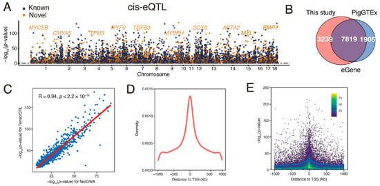 Characterization of cis-eQTLs. (A) Manhattan plot illustrating lead cis-eQTLs for each eGene, where blue and orange points denote previously known and newly identified eGenes, respectively. A subset of eGenes associated with muscle function is labeled for clarity. (B) Overlap of eGenes between this study (N = 582) and PigGTEx muscle studies (N = 1321). (C) The correlation of significance levels (−log10(p-value)) of cis-eQTLs (blue points) was estimated by linear mixed models (LMM) using fastGWA and linear models (LM) employing TensorQTL. The red line represents the linear regression line. (D) Density distribution of significant cis-eQTLs around TSS for each eGene. (E) Distribution of p-values for significant cis-eQTLs associated with each eGene.