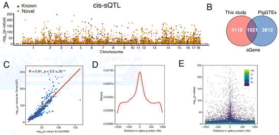 Characterization of cis-sQTLs. (A) Manhattan plot illustrating lead cis-sQTLs for each eGene, where blue and orange points denote previously known and newly identified eGenes, respectively. (B) Overlap of sGenes between this study (N = 582) and PigGTEx muscle studies (N = 1321). (C) The correlation of significance levels (−log10(p-value)) of cis-sQTLs (blue points) was estimated by linear mixed models (LMM) using fastGWA and linear models (LM) employing TensorQTL. The red line represents the linear regression line. (D) Density distribution of significant cis-sQTLs around the junctions for each sGene. (E) Distribution of p-values for significant cis-sQTLs associated with each sGene.