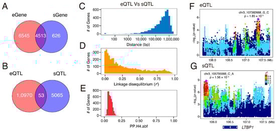 Comparative analysis of eQTLs and sQTLs. (A) Overlap of eGenes and sGenes. (B) Overlap of eQTLs and sQTLs. The distribution of distances (bp) (C), linkage disequilibrium (r2) (D), and posterior probabilities of colocalization (PP.H4.abf) (E) between lead variants of the same eGene and sGene. (F,G) Manhattan plots displaying association signals (−log10(p-values)) for eQTL (F) and sQTL (G) analyses of LTBP1. Each dot represents a genetic variant, colored according to LD with the lead variant.