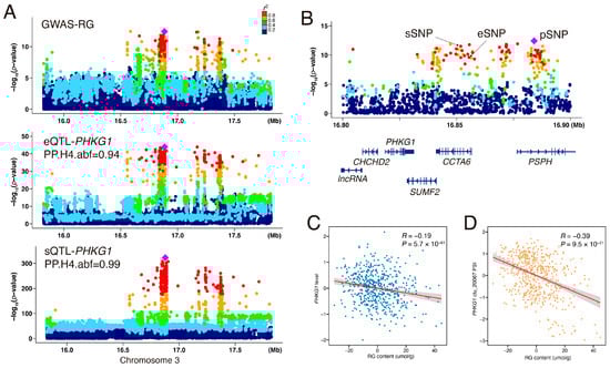 The eQTL and sQTL of PHKG1 colocalized with GWAS signals of RG traits. (A) Manhattan plots of GWAS signals for residual glycogen (RG) content alongside eQTL and sQTL signals (3:16,830,087:16,830,325: clu_20067) for the PHKG1 gene. The lead eQTL is indicated by a purple diamond. Each dot represents a variant, and its color represents the LD degree between the lead eQTL and rest ci-eQTL. (B) Detailed view of the lead SNPs for RG lead GWAS signal (pSNP), lead eQTL corresponding to PHKG1 gene expression (eSNP), and lead sQTL linked to PHKG1 intron excision ratios (sSNP). The position of these SNPs relative to the PHKG1 gene is indicated, with adjacent gene annotations provided below. (C,D) The correlation between RG content and PHKG1 gene expression (C), as well as the correlation between RG content and PHKG1 intron excision ratios (D). Orange and red dots represent individual samples; the red line shows the linear regression fit, with the shaded grey area indicating the 95% confidence interval.