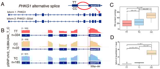 The exon10 splice event in the PHKG1 gene and its association with RG traits. (A) Schematic representation of the PHKG1 exon10 splicing event, producing two transcript isoforms: isoform 1 (PHKG1), which includes the full exon 10 sequence, while isoform 2 (PHKG1-32del), which carries a 32 bp deletion in exon 10. (B) The IGV visualization illustrates genotype-specific splicing patterns (TT, CC, and TC), displaying read distributions across exon10 junctions for different haplotypes of pSNP chr3:16,884,044_T_C. The red box highlights the read coverage over the 32-bp deletion region, indicating a lack of read support in this region for individuals with the CC haplotype due to the deletion. (C,D) Boxplot showing the difference in RG content (C) and the expression ratios of isform2 and isform1 (D) explained by the haplotype (TT, CC, and TC) of pSNP chr3_16,884,044_T_C, excluding 41 individuals with missing genotypes (./.). p-values were calculated by two-sided Student’s t-test.