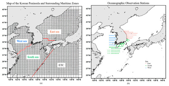 A map depicting the geographic divisions of the Korean Peninsula and surrounding maritime areas (a), along with the locations of oceanographic observation stations in each sea area (b).