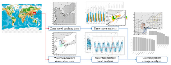 The procedure for analyzing species diversity according to climate change in the waters around the Korean Peninsula is shown in Figure 2. Using reported catch data and observed water temperature data, a spatiotemporal analysis of species diversity was conducted, and trends in water temperature change were identified. In addition, an analysis of catching pattern changes was performed according to changes in water temperature and species diversity.