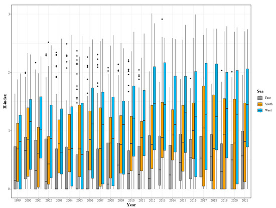 As a result of analyzing the species diversity (H-index) and the species caught in the East Sea, West Sea, and South Sea of Korea from 1999 to 2021, the H-index showed an upward trend in the analyzed seas overall (Figure 3). The East Sea showed a slight increase, but the IQR was the narrowest, maintaining a median value near 1 (Figure 3). Moreover, the length of the whiskers was relatively short compared to the other seas, indicating that the species diversity in the East Sea was relatively stable. In the West Sea, the IQR was wider than that of the other analyzed seas, and the median values were distributed between 1.5 and 2.5 (Figure 3). The length of the whiskers was longer than those for the other seas, indicating that the variability in species diversity was high (Figure 3). For the South Sea, the IQR was narrower than that for the West Sea but wider than that for the East Sea, and the median H-index was maintained between 1 and 2.