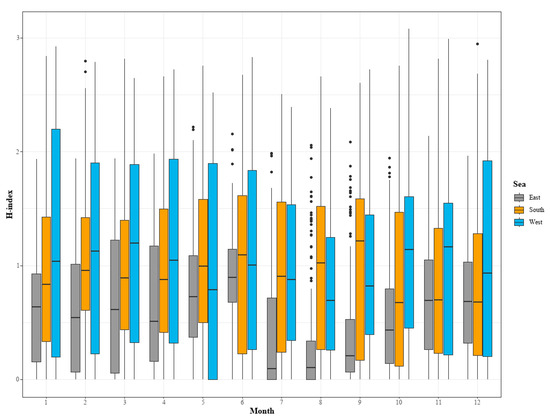 In the West Sea, the median H-index was distributed between approximately 1.5 and 2.5, and it had the widest IQR in most months, showing that the variability of species diversity was greater than that in the other sea areas (Figure 4). In particular, many outliers appeared in July and at the end of September (Figure 4). In the South Sea, the median H-index was generally between 1.0 and 2.0, and the median was high in September and October (Figure 4).