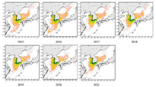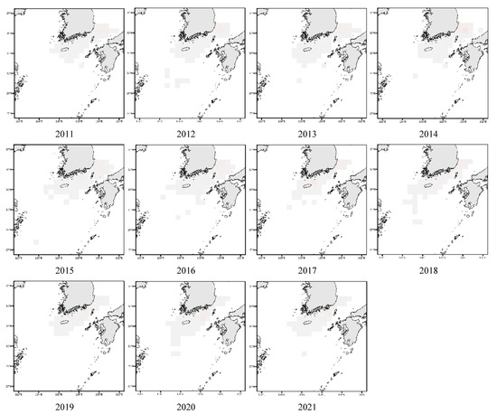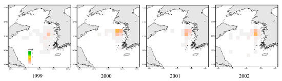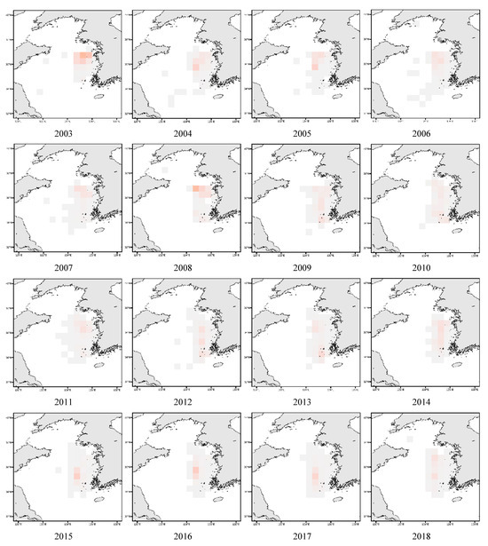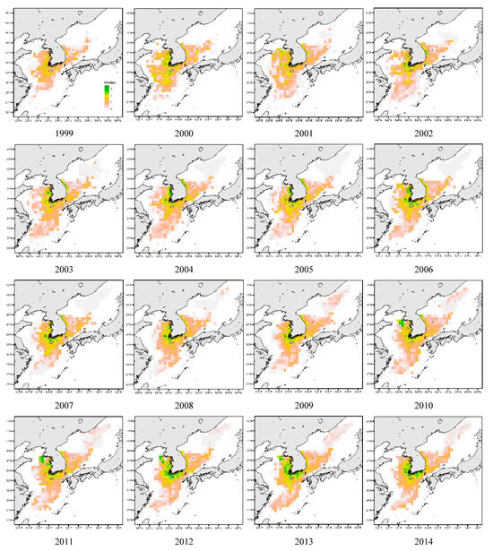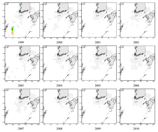 Figure 12 and Figure 13 depict the annual spatial variation in CPUE for Todarodes pacificus. In the East Sea, CPUE values were too low to represent a distinct spatial pattern. In the West Sea, as shown in Figure 12, the CPUE distribution pattern from 1999 to the late 2000s indicated relatively high values around latitude 34–37° N and longitude 124–126° E. In the South Sea, the distribution was initially concentrated in the southeastern region, and later catch activity was observed to expand toward the waters south of Jeju Island (Figure 13).